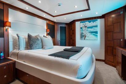 This tri deck motor yacht benefits from two saloon lounges, with the main deck space enjoying a balcony off the starboard side and direct access to an exterior lounge. The bridge deck sky lounge features a bar counter and 50” flatscreen TV.